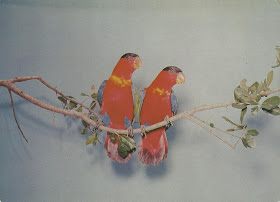 These beautiful Purple Capped Lories are native of New Guinea, but now make their home at Miami's famous Parrot Jungle.  Their beaks are soft and therefore diet on mostly fruit, vegetables, and flower nectar.